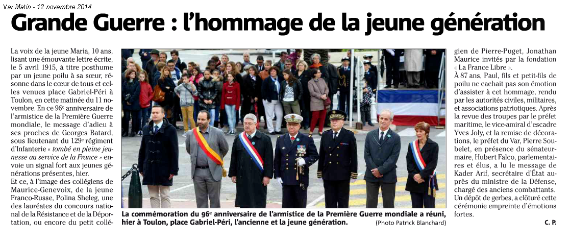 Je représentais à cette occasion, pour le dépôt de gerbe, le jeune sénateur varois David Rachline. La mémoire vive de nos aînés ne nous quittera pas: mieux, elle sera le guide de nos sacrifices de demain pour la défense de notre pays. Dans les pas de ceux qui ont sacrifié leur vie pour la patrie, sachons sacrifier ce qu’il se doit pour cet idéal commun.