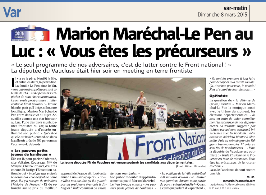 Samedi 7 mars 2015, à l’occasion de la venue de Marion Maréchal-Le Pen au Luc-en-Provence pour soutenir les candidats varois aux élections départementales, Frédéric Boccaletti a répondu aux petites élucubrations du sénateur-maire de Toulon, grand directeur de campagne de ses candidats qui ne semblent plus vraiment exister dans cette campagne.