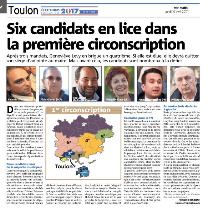 Amaury Navarranne : Les idées s’incarnent dans des hommes. Le défense des idéaux du Front National passe donc par la candidature de ses cadres et militants. Suppléant dans la première circonscription lors des législatives de 2012, engagé au FN depuis le début des années 2000 dans cette ville de Toulon, ma candidature se veut être un symbole de renouveau et de continuité à la fois. La fierté de notre identité française, la défense de nos compatriotes et l’engagement du retour de la justice et du bon sens. Issu d’une famille aux engagements multiples, je veux incarner ici le sursaut légitime du peuple français qui ne supporte plus les abandons ou les mensonges.