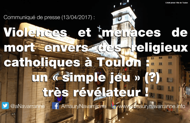 Se rendant à la Messe Chrismale en la cathédrale Ste-Marie-de-la-Seds de Toulon hier soir, un groupe de prêtres et de religieuses a été agressé et menacé par trois jeunes racailles aux cris de « Allah Akbar » et « Vive Daech ». Un sac à dos aurait été plusieurs fois jeté sur les victimes, avec ces mots : « on va tous vous faire sauter ».