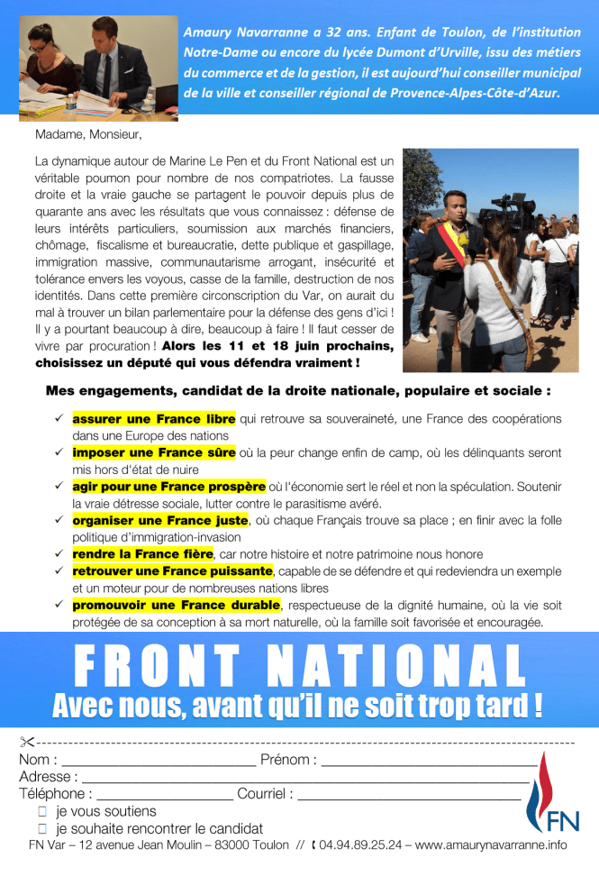Communiqué de presse d’Amaury Navarranne, candidat du Front National dans la 1ère circonscription du Var .
