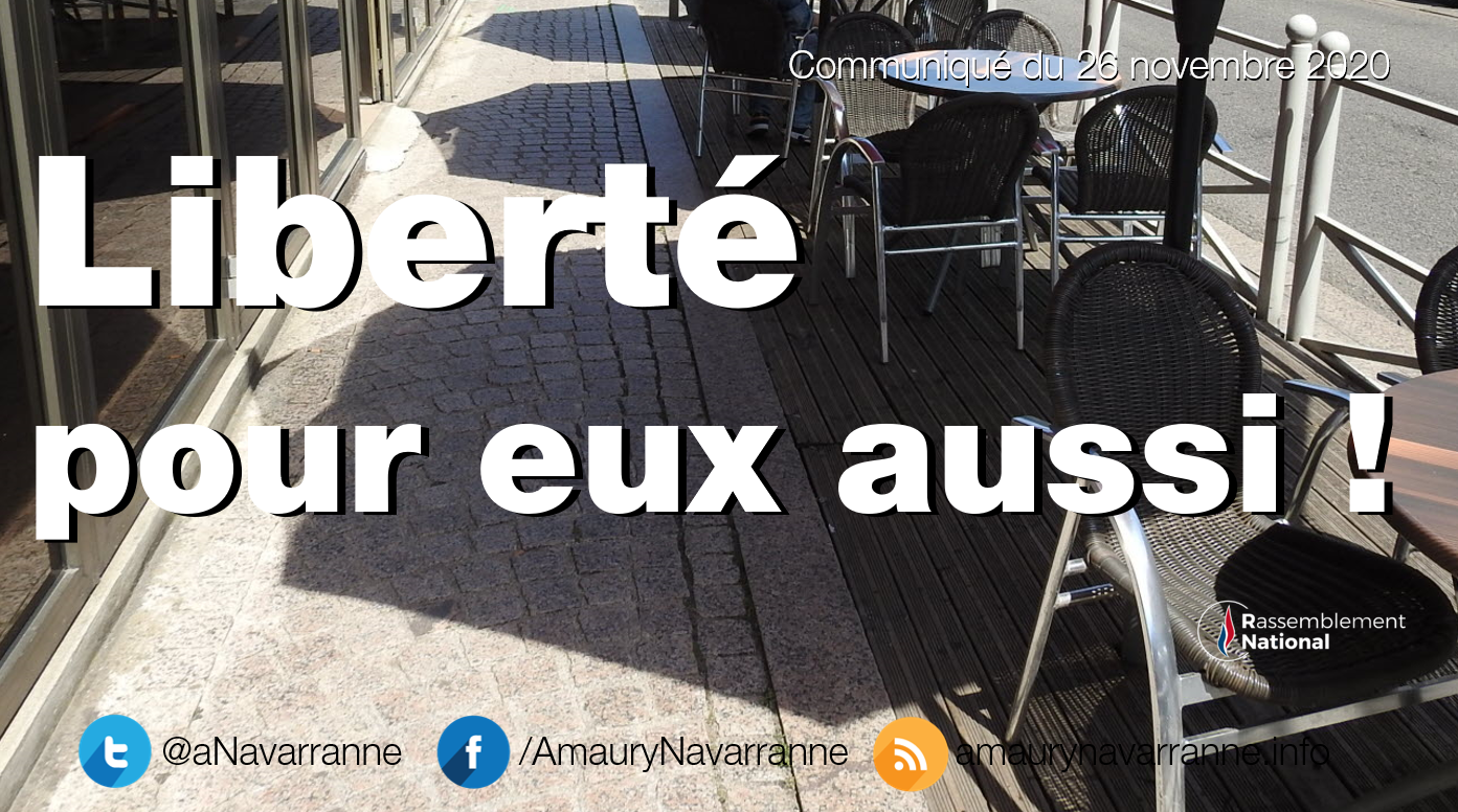 Restaurateurs, cafetiers, discothèques, monde du spectacle et du sport, plongés dans une situation de désespoir absolu par la folle politique d’Emmanuel Macron, avec les élus du Rassemblement National, exigeons la liberté de travailler bien avant le 20 janvier 2021 ou même le 15 décembre.