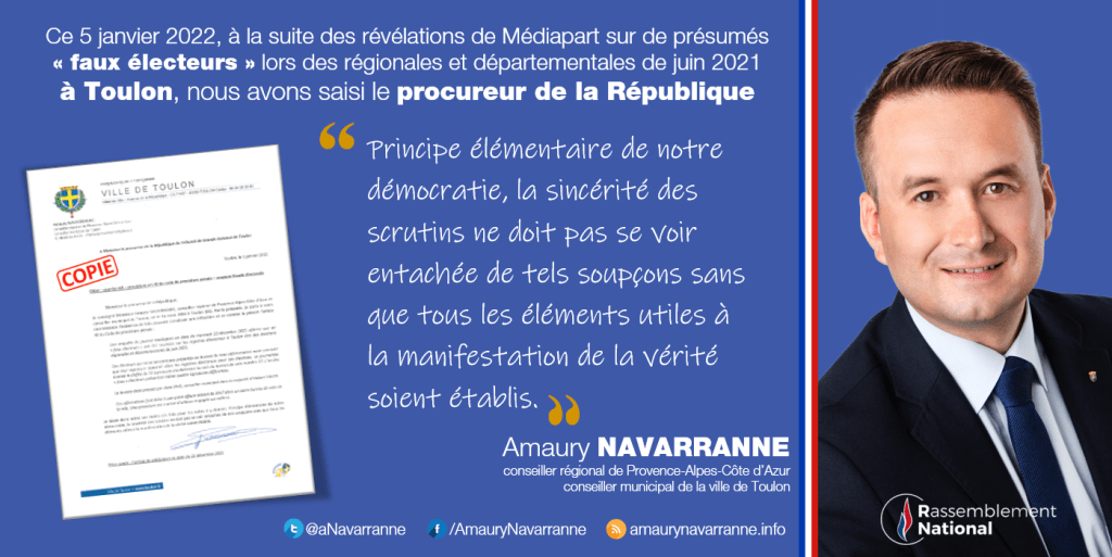 À la suite d’une enquête du journal Mediapart en date du mercredi 22 décembre 2021, qui affirme que de « faux électeurs » ont été recensés sur les registres électoraux à Toulon lors des élections régionales et départementales de juin 2021, j’ai saisi cette semaine le procureur de la République au titre de l’article 40 du code de procédure pénale.