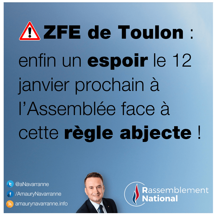 A cette occasion, un texte de proposition de loi sera défendu visant à supprimer les fameuses ZFE, zones à faibles émissions, parfaites illustrations de l’écologie punitive antisociale que nous combattons. Les propriétaires des 50.000 véhicules qui seraient par exemple exclus de toute circulation dans la zone qui devrait voir le jour dans la métropole de Toulon pourront respirer à nouveau !
